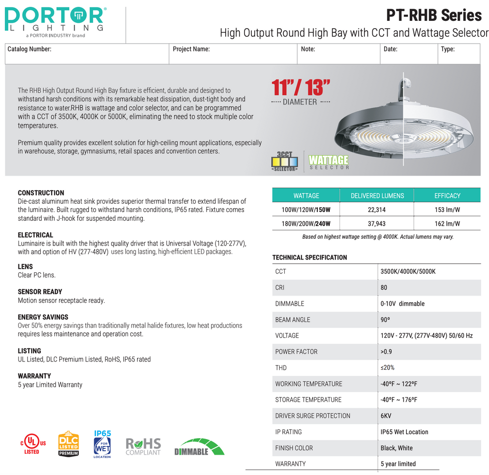 The RHB High Output Round High Bay Fixture is efficient, durable, and designed to withstand harsh conditions with its remarkable heat dissipation, dust-tight body and resistance to water. RHB is wattage and color selector, and can be programmed with a CCT of 3500K, 4000K or 5000K, eliminating the need to stock multiple color temperatures. Premium quality provides excellent solution for high-ceiling mount applications, especially in warehouse, storage, gymnasiums, retail spaces and convention centers.